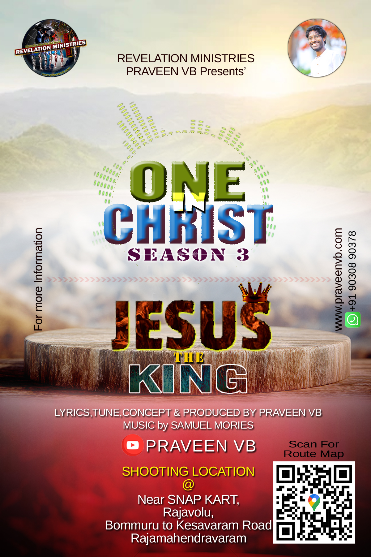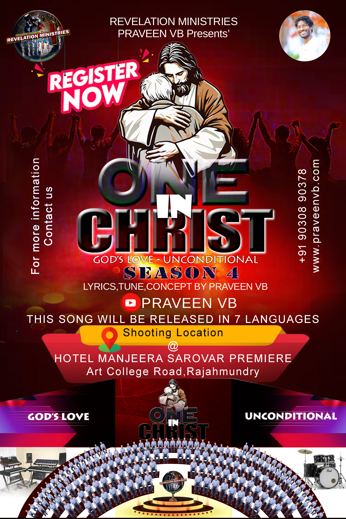 మన ప్రభువును మన రక్షకుడైన యేసు క్రీస్తు నామములో సహోదరి, సహోదరులకు శుభాలు తెలియజేస్తున్నాను… దేవుడు ఇచ్చిన ఆలోచనను బట్టి క్రీస్తులో అందరూ ఒక్కటే అనే ఉద్దెశంతో క్రీస్తు నామమును అందరూ ఒకే చోట కూడుకొని స్తుతించాలన్న ఆశతో ONE IN CHRIST అనే Platform ద్వారా రెండు seasons లో కొంతమంది దైవసేవకులుతో కలసి దేవుని నామాన్ని స్తుతియించడం జరిగింది, ఇప్పుడు మరల ఇంకొక season ద్వారా ఇంచుమించు 3000 మందికి పైగా యవ్వనస్తులందరు ఒకేచోట కూడుకొని దేవుని నామమును ఆరాధించుటకు ఇది ఒక గొప్ప సదవకాశం.ఆసక్తిగల 14 నుండి 50 సంవత్సరములు వయస్సు గలిగినవారు మీ వివరములను రిజిస్ట్రేషన్ ద్వారా మాకు తెలియజేయగలరు. ( రిజిస్ట్రేషన్ పూర్తిగా ఉచితము ) మీ వివరములు పైన చూపబడిన Registration Form ని Click చేసి నమోదు చెయ్యగలరు. ఇట్లు…… మీ సహోదరుడు ! ప్రవీణ్ వీబీ ……దేవుడు మిమ్ములను మీ కుటుంబములను దీవించి ఆశీర్వదించును గాక ! ఆమెన్. ******* worship & shooting జరుగు Date & Place Registration చేసుకున్నవారికి WhatsApp లేదా మెయిల్ ద్వారా తెలియజేయబడుతుంది.*******